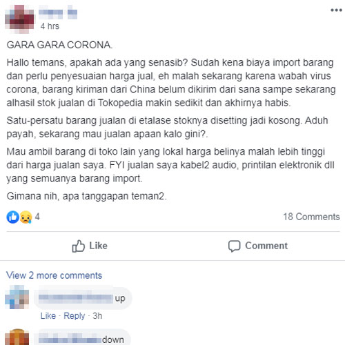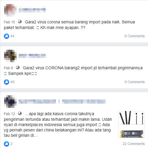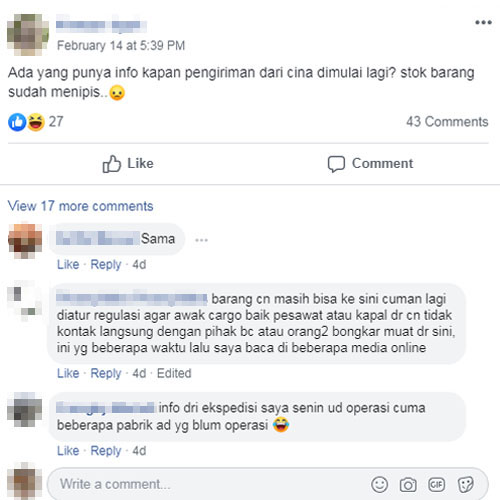 Setelah menelusuri beberapa forum, kami menemukan hal yang serupa. Banyak pedagang yang mengeluhkan barang dari China sudah beberapa bulan tidak masuk dan persediaan barang mulai menipis. Banyak pabrik China yang menyatakan akan kembali beroperasi kembali Februari 2020, sejak Januari 2020 kemarin. Kenyataannya, per hari ini malah semakin banyak pabrik yang menyatakan estimasi beroperasi kembali akhir Maret 2020.